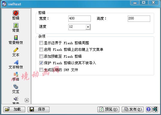 一款非常棒的Flash文本特效动画制作软件,可以制作超过200种不同的文字效果和20多种背景效果,可以完全自定义文字属性,包括字体、大小、颜色等等,使用SWFText完全不需要任何的Flash制作知识就可以轻松的做出专业的Flash广告条和个性签名!
