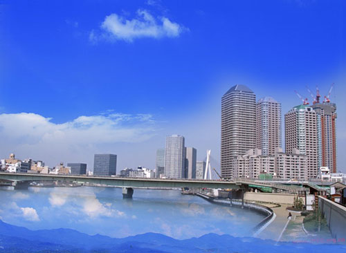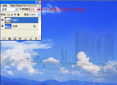 降低要融入背景图图片的图层透明度,会出来一种“你中有我,我中有你,隐隐约约,似有似无”的梦幻效果,做沙漠、大海上的海市蜃楼及水面倒影效果会非常不错的。下面是我的作业: