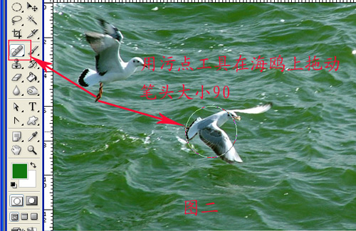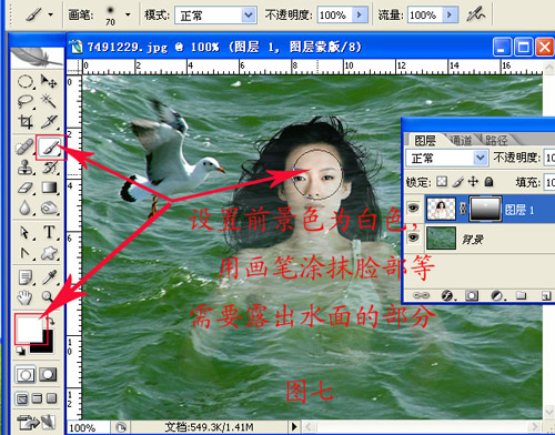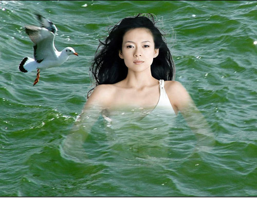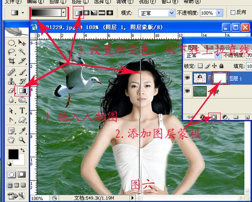 8.水、人无缝合成,效果不错吧。原理嘛,应该是:黑色到白色渐变中,黑色为遮挡,不可见,逐渐向白色可见过渡。