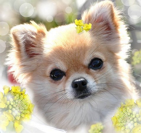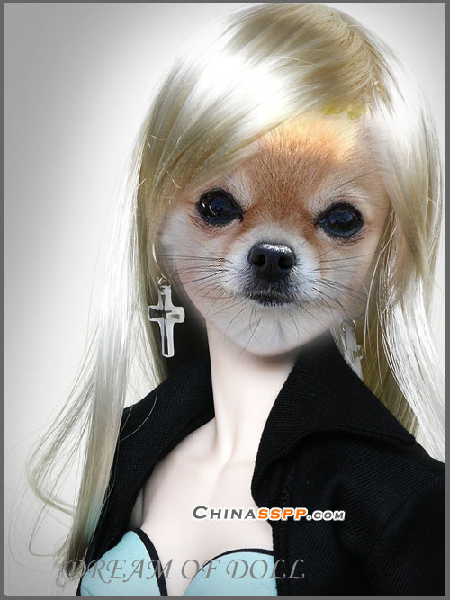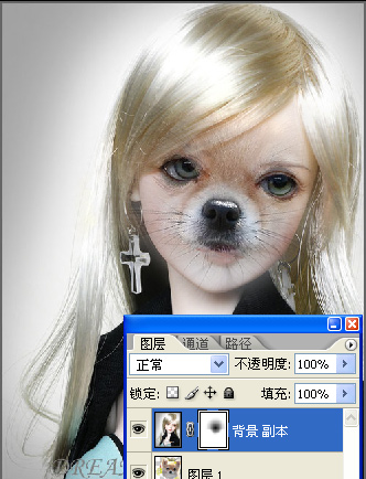 制作中,先降低MM的透明度,把狗狗的脸与MM的脸对准,然后在蒙板上用柔笔刷出狗狗的脸就OK啦。下面是用径向渐变做的合成