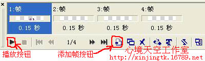 我们想把彩色文字动起来就需要添加多个帧来实现才能完成动画,咱们来看帧面板见(图十一)第一帧我们在上面已经把他做好了,接下来做第二帧点一下添加帧按钮,在帧面板就多了个空白画面帧,制作跟上面讲到的一样去做就可以了。但是文字颜色不要一样《例如:第1帧红色文字、第2帧紫色文字、第3帧蓝色文字、第4帧绿色文字、等等》,字体大小一定要一样。制作好第二帧后,再去帧面板里点添加帧按钮,也就是说添加第三帧了,制作同上,按这个步骤去添加制作第四帧,或者第五帧等等!制作好了后我们就来试一下动画效果,在帧面板下面有个播放按钮点击试看动画了,如果动画感觉快了或者慢了,可以在第一帧到第四帧的每个帧面上双击就出来(画面帧属性)默认数字是10,现在把这个数字改成15 点确定,在帧面板里就可以看到改成0.15秒了。如果数字越大播放速度就越慢。
