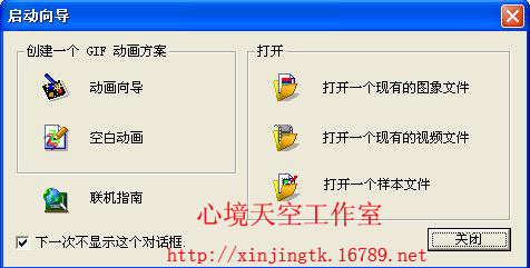 首先我们来打开ULead Gif软件,软件打开后出来一个对话框(见下面 图2)我们可以在对话框里把(下一次不显示这个对话框打√)再点关闭。这样下一次打开就不会再出来这个对话框,也可以不打√直接点关闭,这个我就不多说了大家应该都知道。