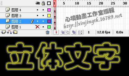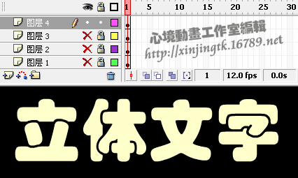 把文字打散,再新建三个图层,在文字选中的状态下分别把文字原样复制到三个图层里的第一帧,然后把1.2.3图层隐藏及上锁。如图1-2所示。