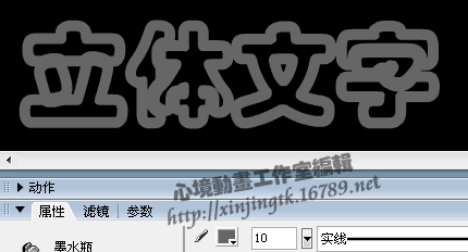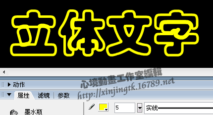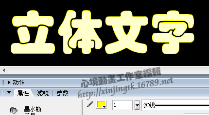 (1) 在制作描边立体字之前,我们先要学会如果制作Flash描边文字。使用菜单“文件/新建”新建一个空白文档。在工具箱选用 “文本工具”,并把属性设置为“华文琥珀”,字体为96像素,颜色为“#FFFFCC”在舞台上输入“立体文字”四个字。