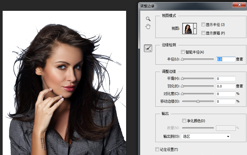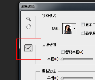 3.【ctrl+shift+I】反选选区,选区基本上已经把花姑娘包围了,接下来就是大招,【选择】-【调整边缘】-【调整半径工具E监测区域】就是左侧第三个一只画笔那个,还不知道就看下面的截图:
