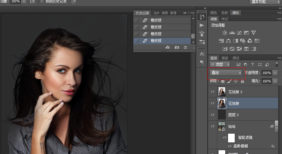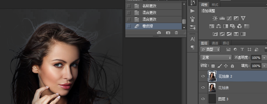 7.喜欢鼓捣的朋友会发现背景再暗再按些灰色的"洗发水"又出来了~~如图。别怕,还有办法,复制已经抠出来的花姑娘这层(假如取名花姑娘2),把原来的"花姑娘"放在"花姑娘2"下面,对"花姑娘"的混合模式进行调整,比如调整成【叠加】,再用软边的橡皮擦把"花姑娘2"的灰色发梢轻轻擦去,我勒个去!perfect!!