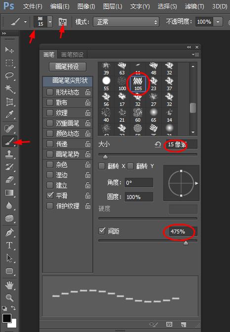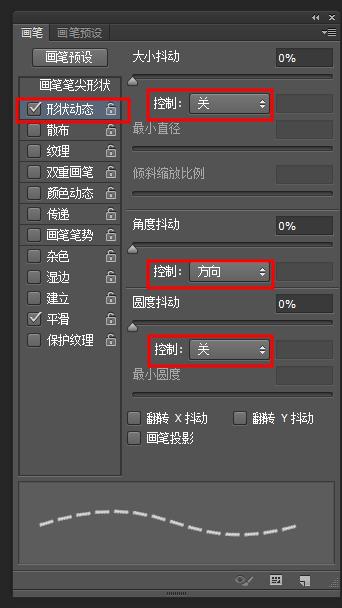 选中photoshop笔刷,找到我们刚创建的笔刷。为了设计出更加逼真的效果,我们需要在photoshop笔刷预设面板中进行一些设置。 你可以在预览窗口看到现在的缝合流动的更加自然,因此现在我们可以开始’缝’。