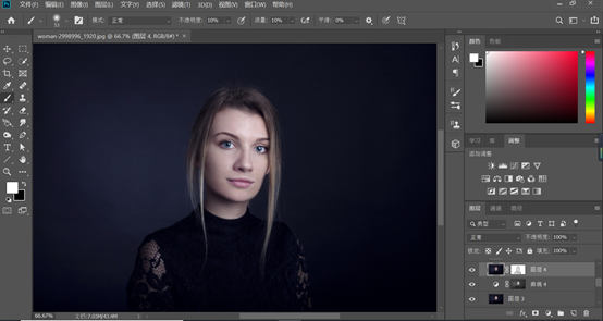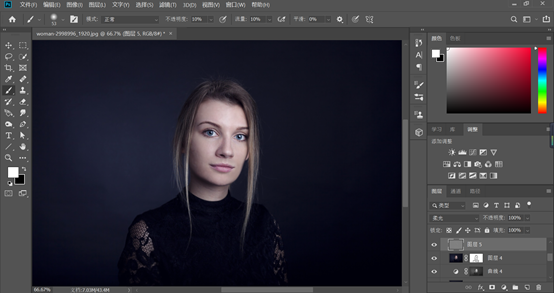 使用中性灰磨皮时,我建议你,画笔的笔触采取柔光,不透明度和流量选择10%左右,亮则减,暗则加,为了节省时间,这里我就简简单单大致稍微磨了一下下,效果并不是很好,如果认真的磨的话,这张照片可能得花费我一个多小时