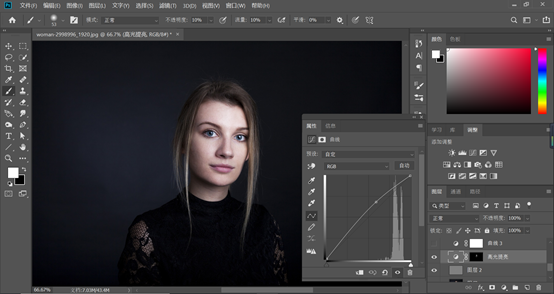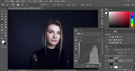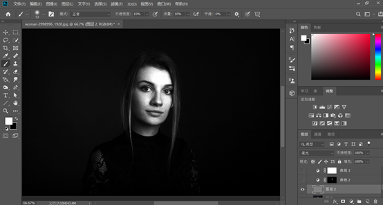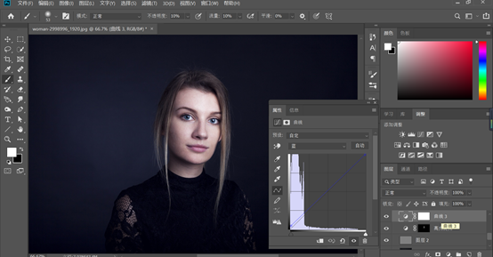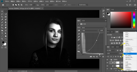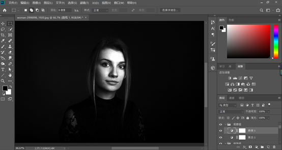 接下来我们在图层面板下方的填充或者调整图层,新建一个黑白调整图层和曲线调整图层,曲线的设置最好能清楚的看到脸上的明暗情况,面部的斑点细纹