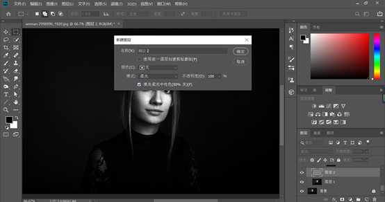 接下来我们新建一个图层,将其填充为50%度灰,图层样式设置为柔光,进行中性灰磨皮