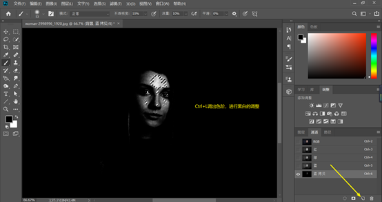 磨完以后我们关闭观察层,在选择背景图层,进入通道,复制蓝色通道,Ctrl+L调出色阶,调整明暗对比,我们这一步的目的是将面部的高光区域提亮,所以大致选中部分面部如下图,然后按住Ctrl键点击蓝拷贝通道缩略图创建选区