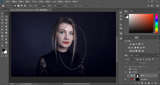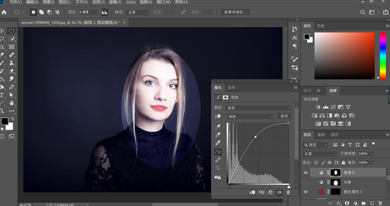 最后我们帮人物打一个光线,用椭圆选区工具,建立一个较大的椭圆选区,然后建立一个曲线的调整图层